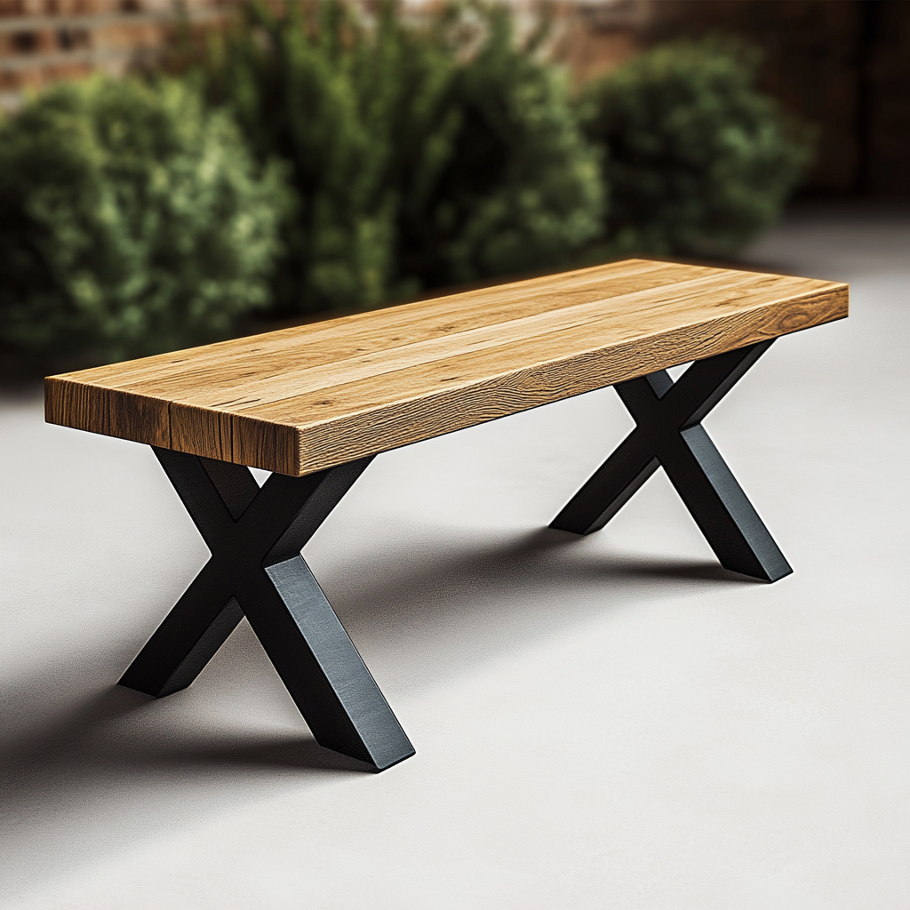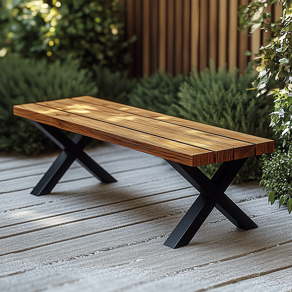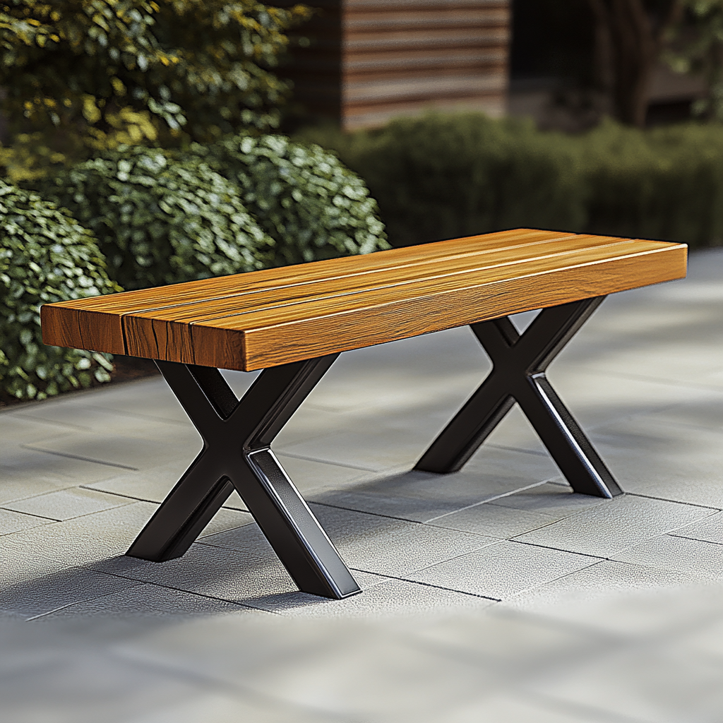 The bench is supported by thick, sturdy X or U legs, providing a stable and reliable foundation for your outdoor space. Its generous seating area invites comfort, making it perfect for quiet moments of solitude or lively gatherings with friends and family. The warm, earthy tone of the wood enhances any garden or patio, seamlessly blending with natural surroundings.